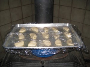 Removed and punched down the dough. Cut the dough into thirds, put 2/3 in fridge for later use and rolled the remaining 1/3 out to about 1/2 inch thick dough. I cut these out with a round cookie cutter about 2″ size. To get the crescent shape I folded the circles in half. Moving them to a lightly sprayed cookie sheet. Covered and let rise for about 30 minutes till almost double. I found mine did not rise as much as I would like, but I think my yeast may have not been good. Good idea to prep the yeast in sugar and water first to check to make sure its activated! Bake at 375 for about 10-12 minutes till golden brown.
