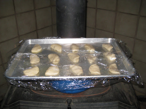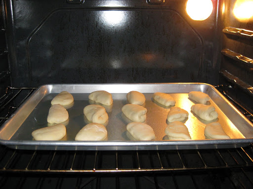 Removed and punched down the dough. Cut the dough into thirds, put 2/3 in fridge for later use and rolled the remaining 1/3 out to about 1/2 inch thick dough. I cut these out with a round cookie cutter about 2″ size. To get the crescent shape I folded the circles in half. Moving them to a lightly sprayed cookie sheet. Covered and let rise for about 30 minutes till almost double. I found mine did not rise as much as I would like, but I think my yeast may have not been good. Good idea to prep the yeast in sugar and water first to check to make sure its activated! Bake at 375 for about 10-12 minutes till golden brown.
