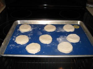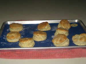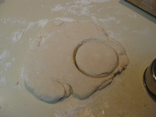 Roll dough out to about 3/4 of an inch and cut with cutter, assemble scraps and lightly knead and roll out to make the remaining biscuits. Makes about 8 biscuits.