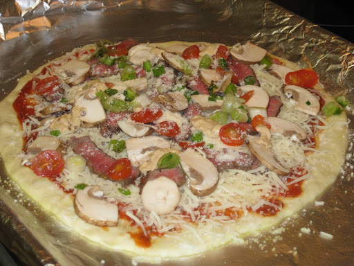 Top with Cheese then steak, and then veggies. When dealing with the tomatos, i like to seed them as I dont want all the juice, it makes the pizza soggy. I like to use tenderloin that has been grilled or broiled to medium rare, cooled and sliced thinly. You want the most tender meat you can have, since chewy meat on pizza is not good eats! I use about 1/2 a very small tenderloin for my 10 inch pizza.
