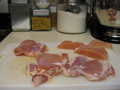 3 large or 4 small chicken thighs and one large breast, I skin and bone them, discarding the skin and keeping the bones.