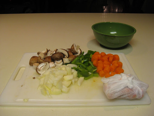 Prep veggies.Rough chop onion and carrot. I use about 1 inch chunks. Seed and de rib the green pepper and chop to one inch chunks. If your mushrooms are large half them , small ones are good whole. Smash the garlic and rough chop, no need to finely chop it as it will stew for a while an break up naturally.Lightly sauté in the pot you used for chicken, there should be enough oil left over to lightly sauté the veggies.