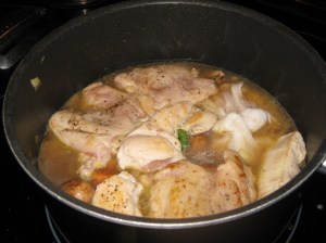 Here is where the cheesecloth and the thigh bones and breast bones come in. I add wrap these up in cheese cloth and add to the pot at this time.This will make a nice broth along with the chicken pieces. You could use bone in chicken in the stew, but I don’t like this. As this will simmer for a few hours to develop the taste the bones fall apart and you end up with thigh bones and breast bones in the broth, which are no fun when you bite in them. This method allows you to use the bones for flavoring, but makes it easy to remove them at the end for ease of serving and eating.